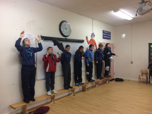 Next we pulled everyone in for a review of the Shield Camp that the PLs & APLs were on. We got to hear what they though of the camp and the standards they saw. What they liked about it and what they didn’t. It is very important to review these activities so that we can learn from them and make improvements as we go along. It is always a work in progress. We also discussed participating in the Darkness into Light event in Skerries on 9th May as marshals. The event organisers have asked for local scout groups to help them out. Some of the scouts were very interested. The scouts are to check it out with their parents and let us know next week as it means an all night activity. We also discussed Summer Camp and asked everyone to confirm if they will be attending or not by paying a deposit by next week. Some parents paid before the meeting started which was great to see.