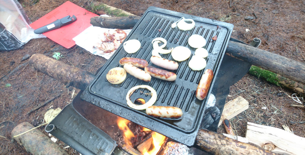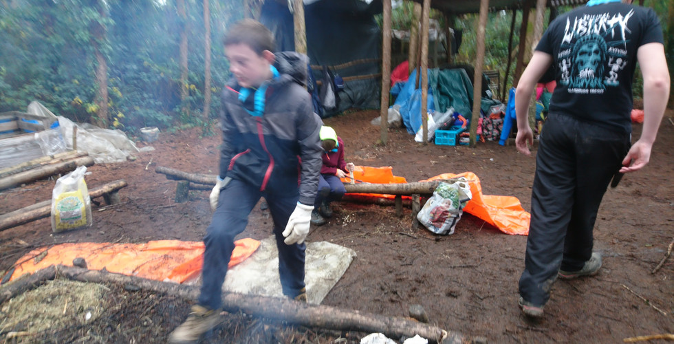 We decided that we needed to get a fire going so myself , Sean, Alex and Keeva worked on this. But everything was damp, despite the fact that we had dry tinder with us and our fire starting kits it just wasn't working. We were getting frustrated but didn't give up. In the end when we had a spark and yet another "nest" of fire etc Ross came over and put three or four "feather sticks" on our fire and hey presto we had a fire that was happily burning, after that it was just a question of feeding the fire and that was our main fire for the day.